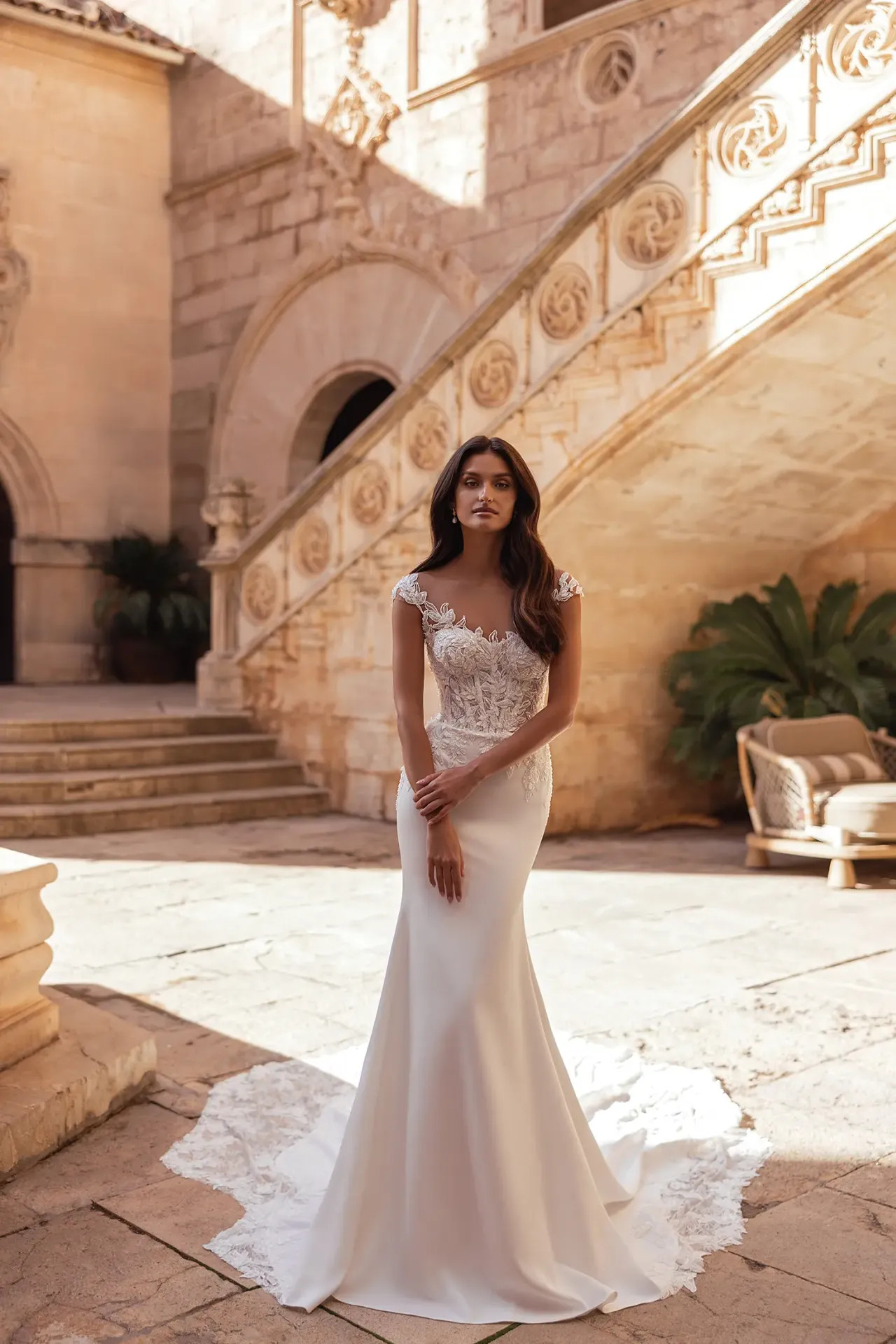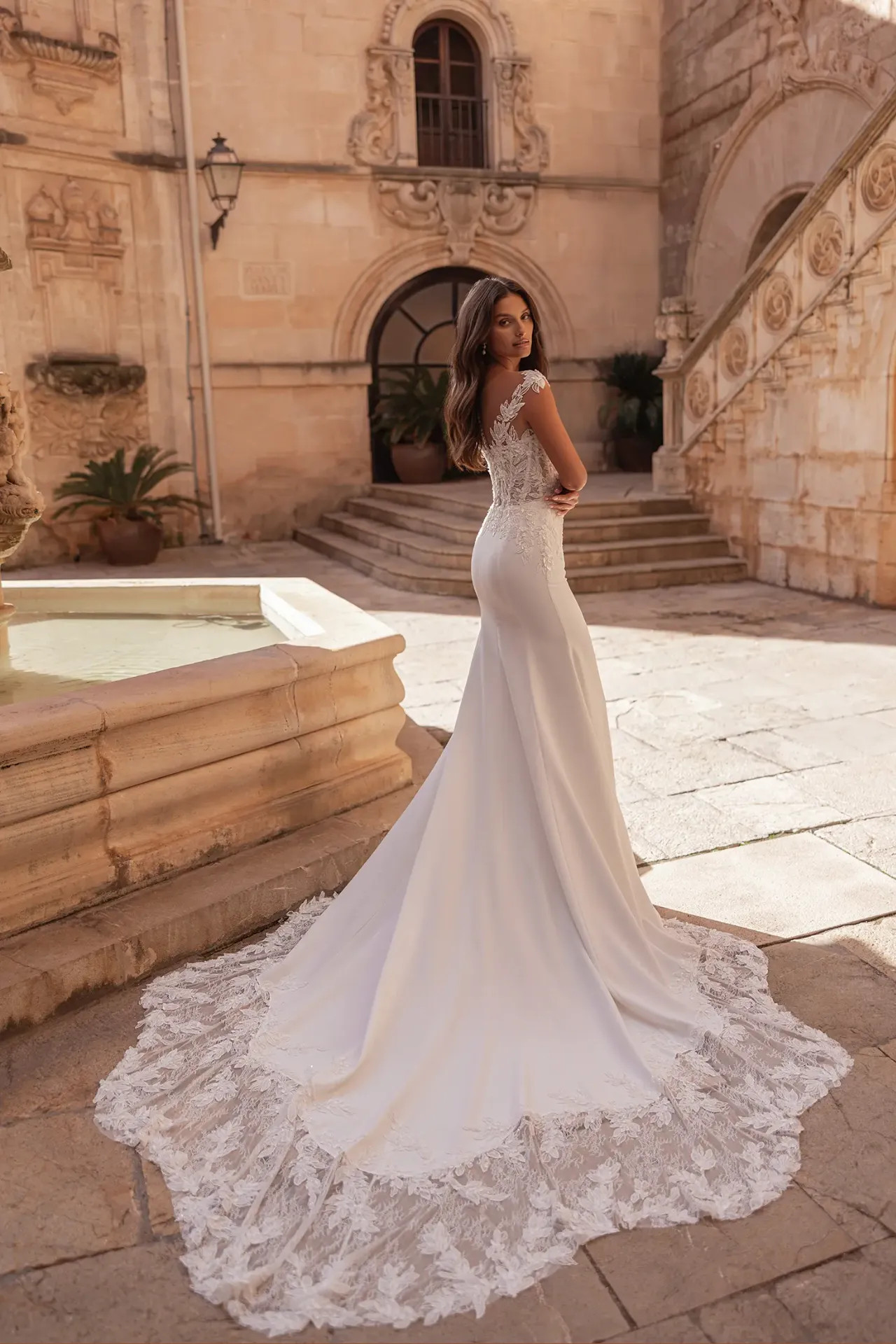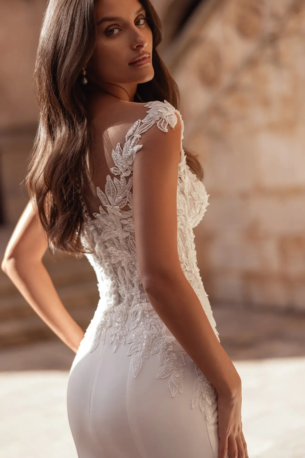 Stylist tipp: A Prudence a tökéletes választás, ha imádod a csipkét, de nem szeretnél nehéz, merev szoknyát viselni. A Holdfény Szalonban azért ez az egyik kedvencünk, mert a krep-sifon kényelme és a látványos hátmegoldás párosa egyszerre teszi modernné és végtelenül elegánssá a menyasszonyt. Egy laza, feltűzött frizurával érvényesül legszebben a ruha különleges hátrésze!