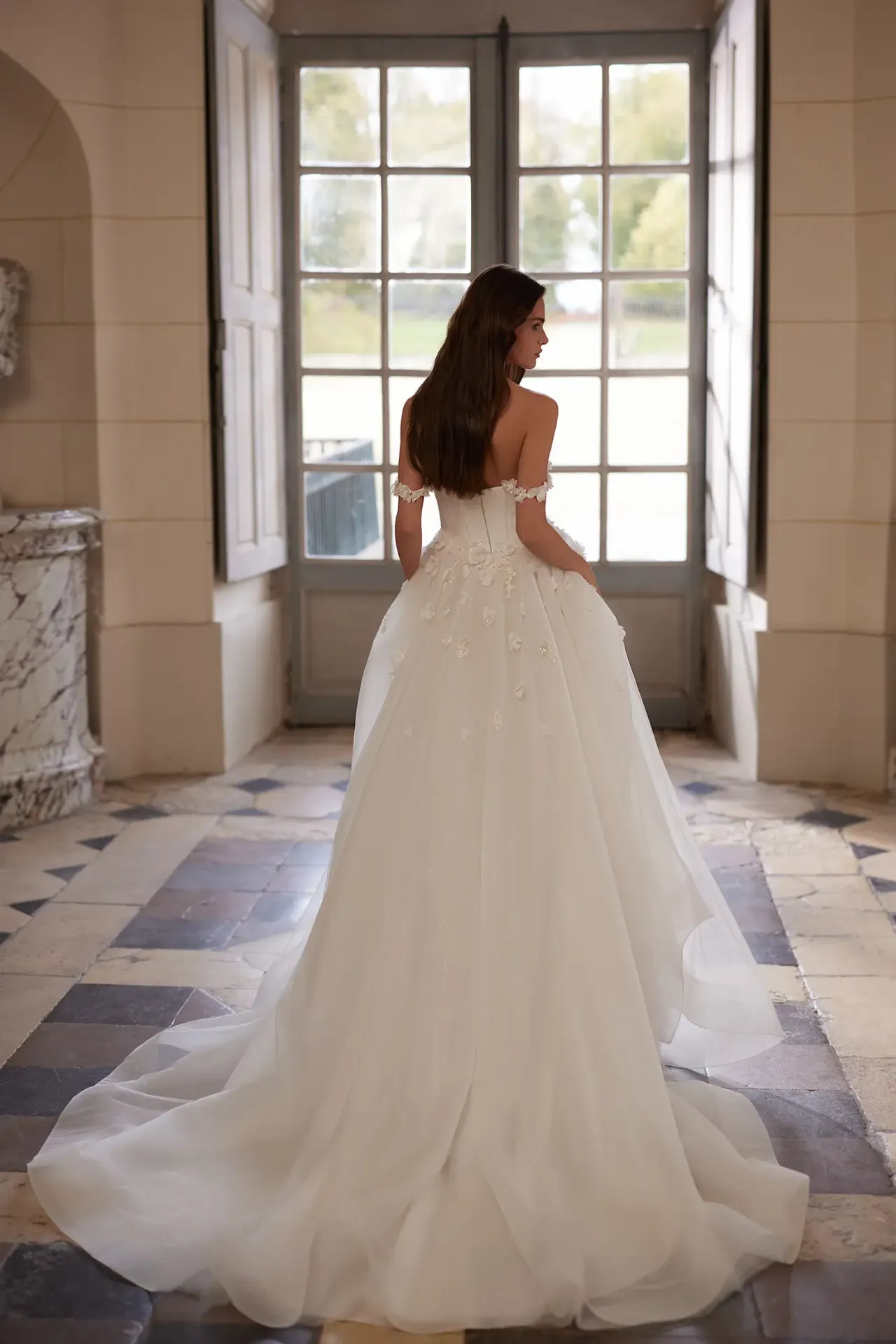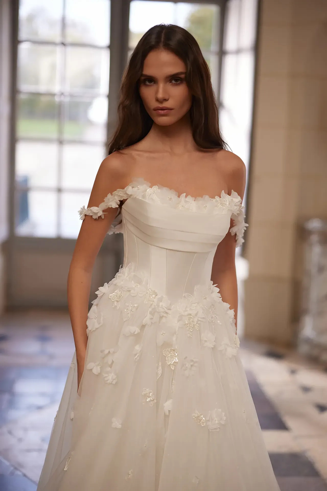 Stylist tipp: A Snow egyik legnagyobb előnye az alakformáló mikádó fűző és a légies tüll szoknya kontrasztja. A Holdfény Szalonban azért imádjuk, mert a pántok és a virágdíszek lágyítják a vonalakat, így ez a ruha egyszerre tűnik határozottnak és végtelenül törékenynek.
