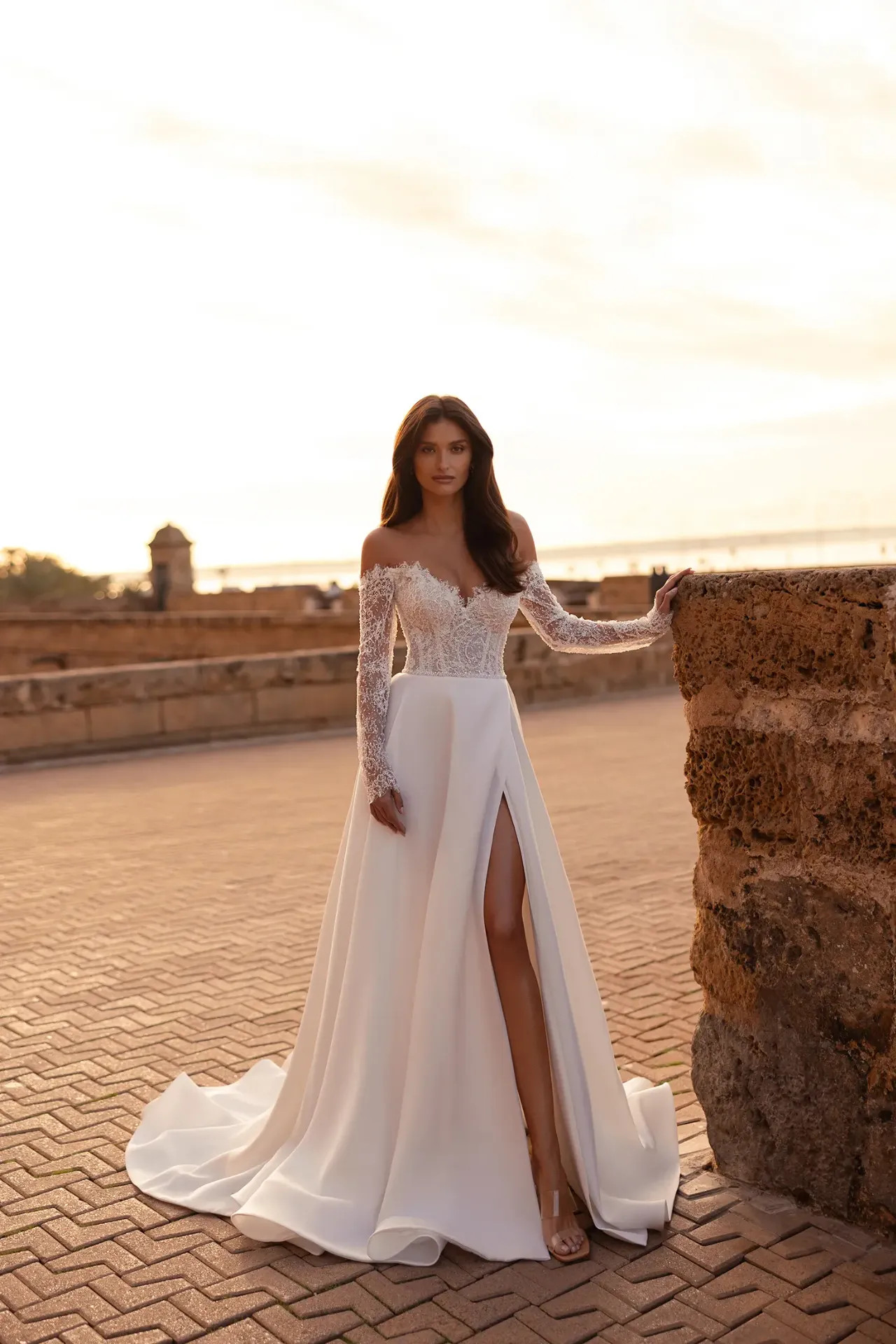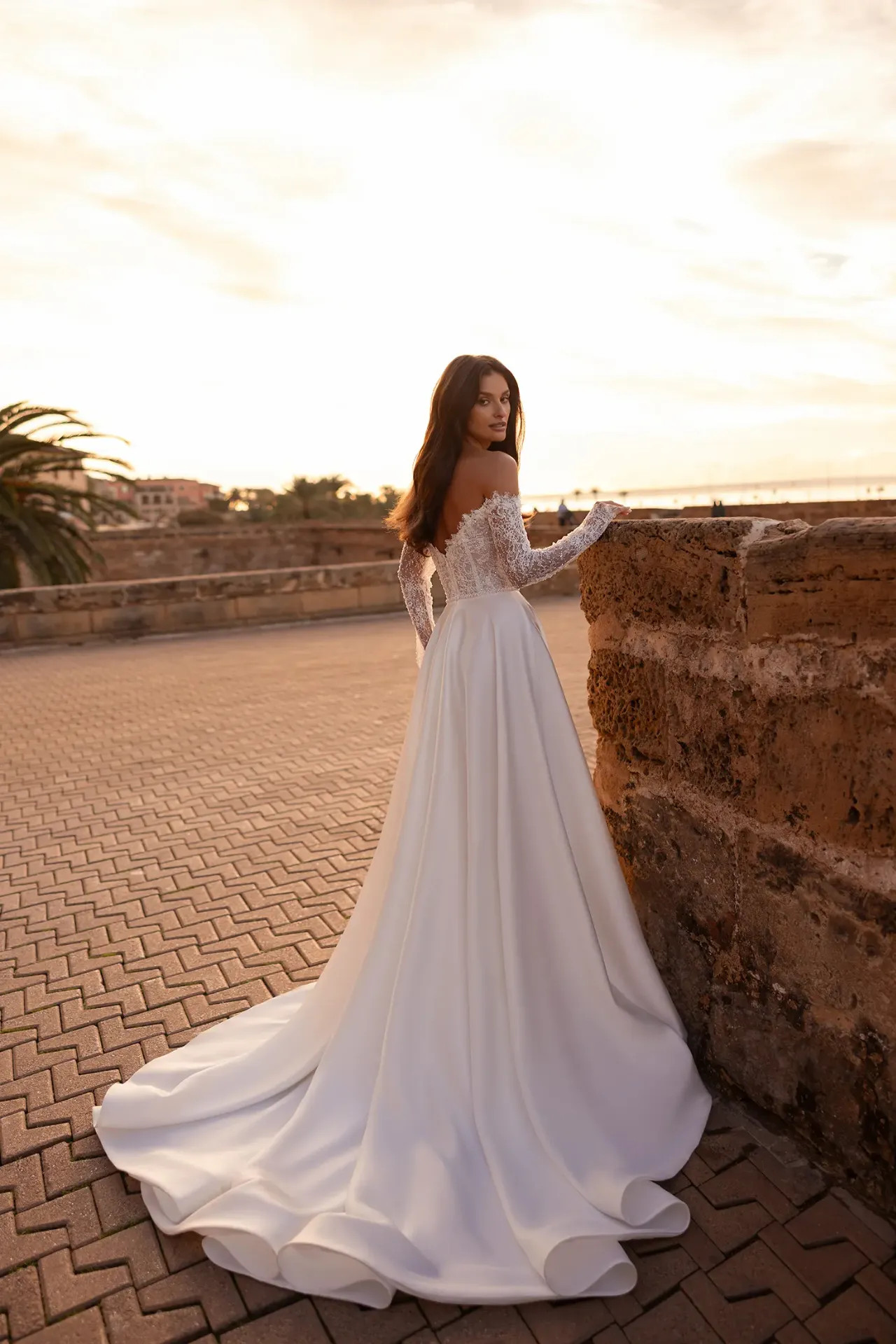 A Sofia ruha azoknak a menyasszonyoknak készült, akik az örök klasszikusokat keresik, de vágynak egy-egy modern, karakteres részletre is. Ez a modell a nemes mikádó selyem tartását és a csipke lágyságát használja fel arra, hogy egy egyszerre méltóságteljes és vonzó sziluettet teremtsen.