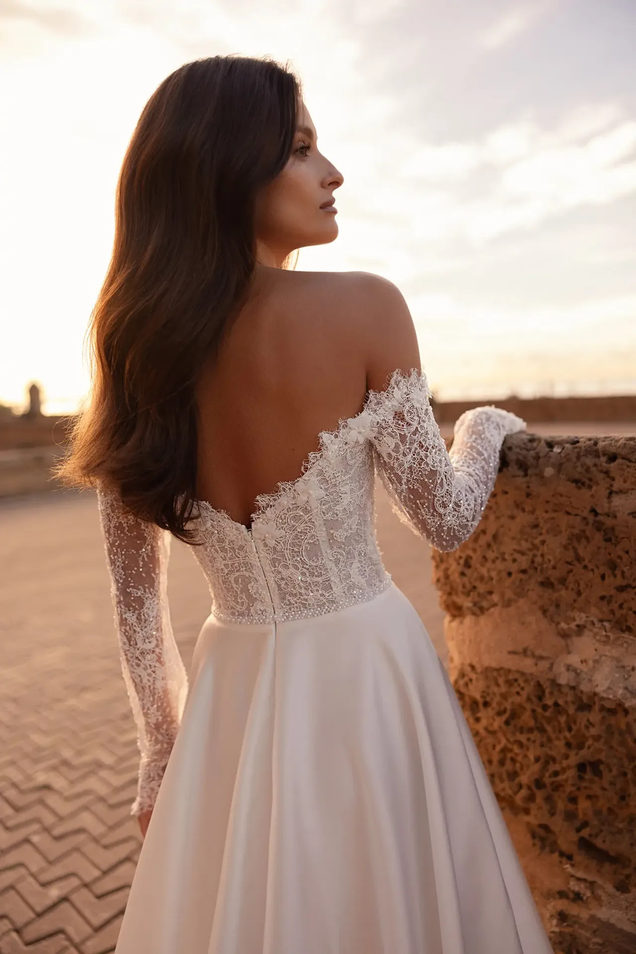Ragyogó csipke felsőrész: Az ejtett vállú, hosszú ujjú felsőrész finom csipkéből készült, amelyet apró gyöngyök és flitterek díszítenek. A puha glitter tüll alap biztosítja azt a belső ragyogást, amelytől a menyasszony arcra valósággal felderül.