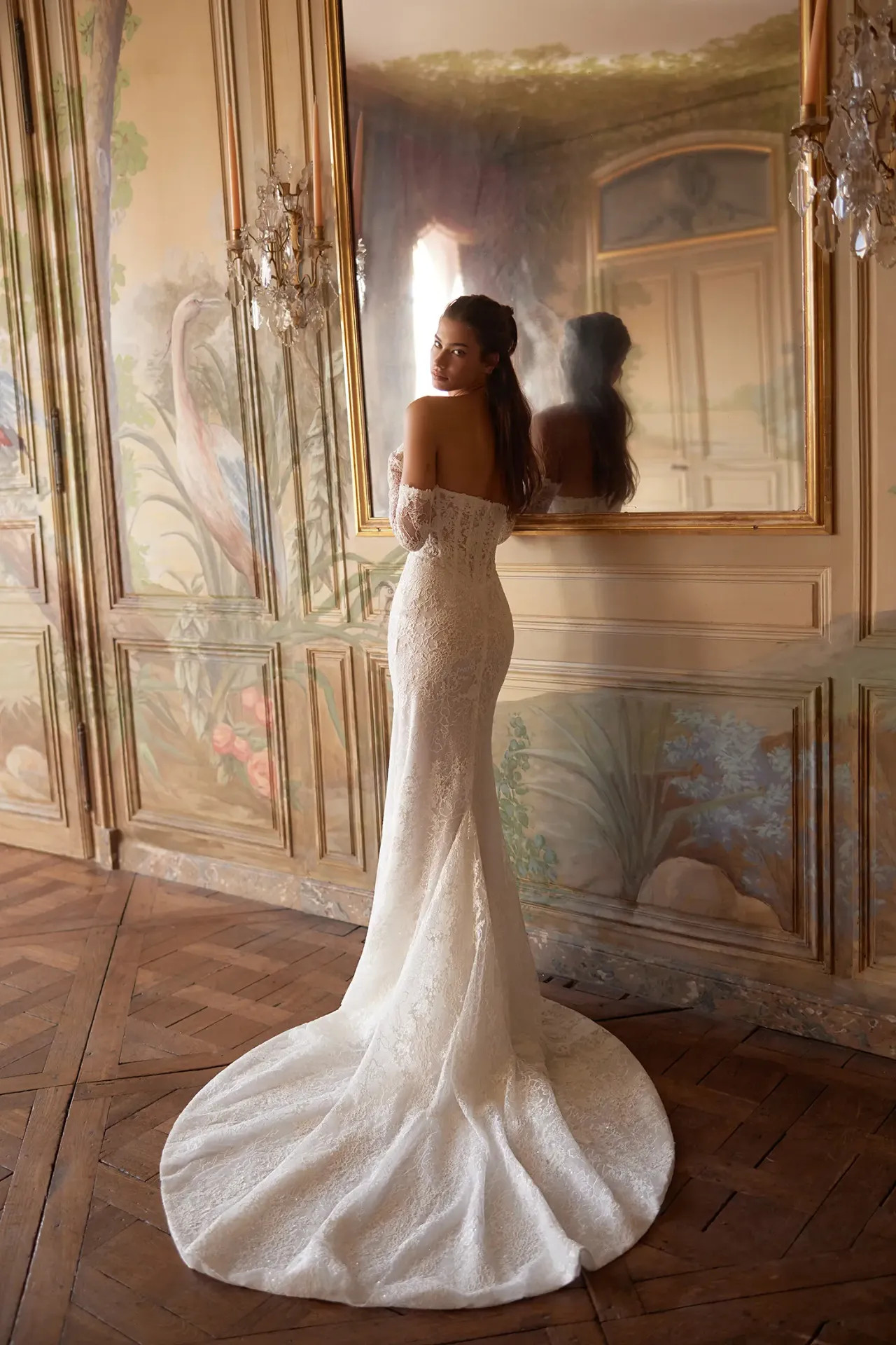Mesteri fűző és Alençon csipke: A felsőrész egy teljes mértékben merevített, alakformáló fűzőből áll, hangsúlyos kosarakkal. A nemes Alençon csipke alatt egy finom glitter tüll réteg húzódik meg, ami sejtelmes, belső fényt ad a ruhának.
